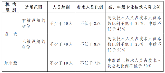 辐射环境监测与监察机构人员编制标准、技术人员占总人数的比例及高、中级技术人员的比例见表1。