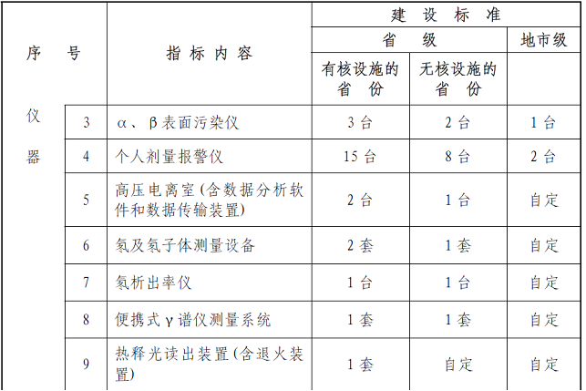 基本仪器设备是保障辐射环境监测与监察机构开展辐射环境质量监测(包括土壤、空气、水体、生物样品、陆地、口岸、海洋、电磁等项目的环境质量监测)、核设施和辐射源监督性监测(包括各类核设施、铀矿冶、放射性废物处理处置设施、电磁辐射设施、放射性同位素与射线装置、伴生放射性矿等)、日常核与辐射安全监督检查和执法的基础条件。辐射环境监测与监察机构必须配置的仪器设备的最低配备标准见表4。